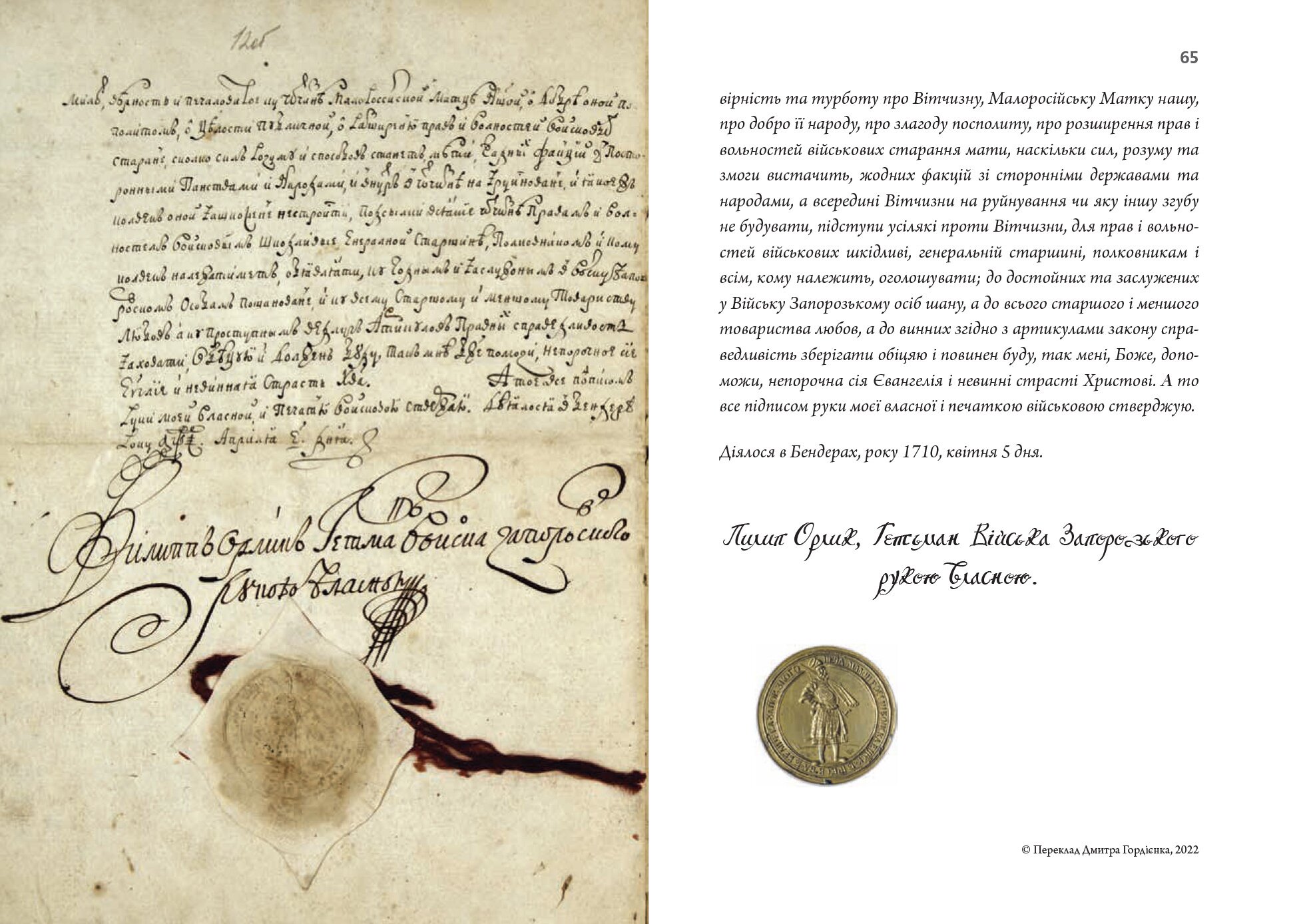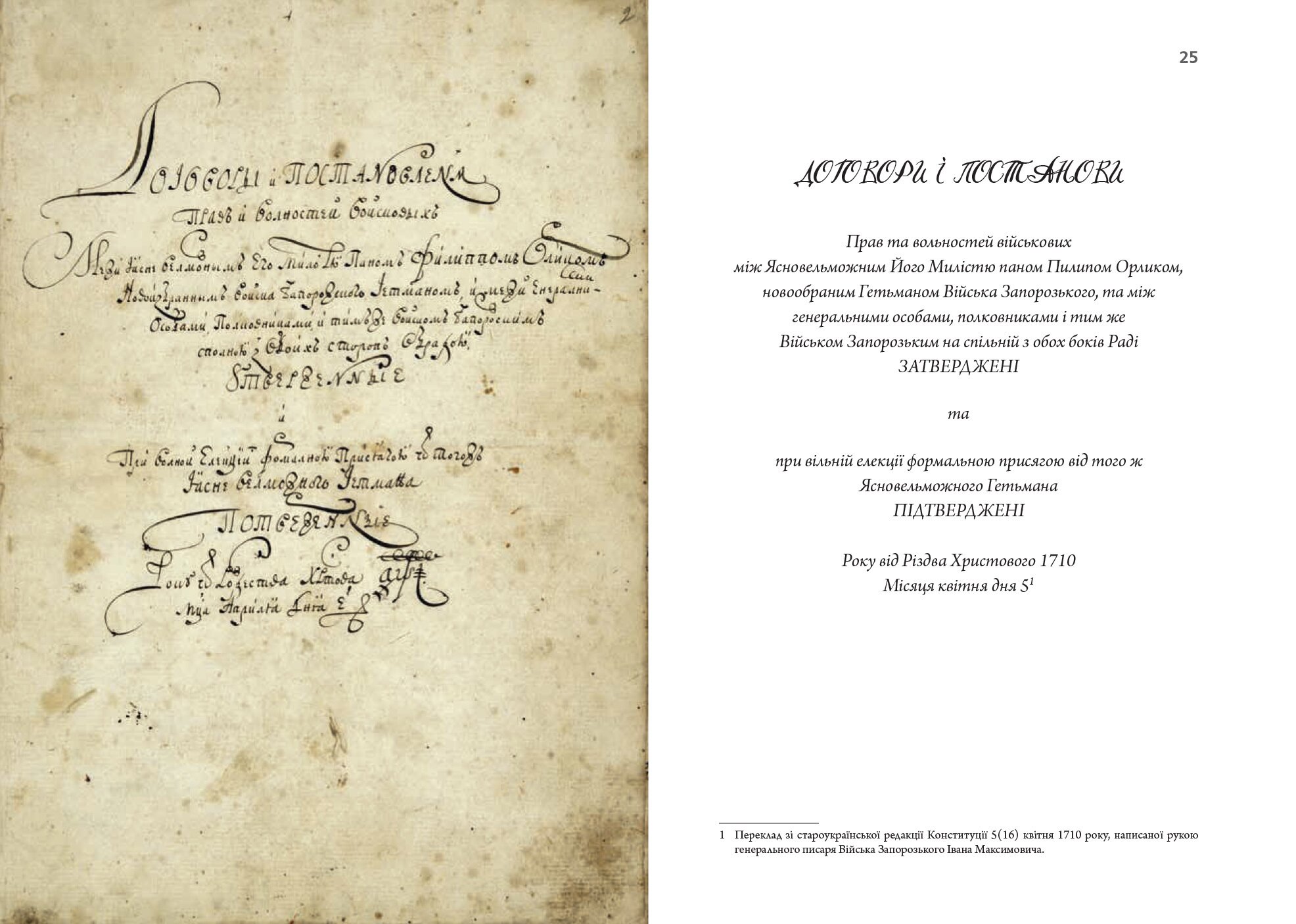 Перед вами факсимільна копія першої у світі конституції, більш відомої у нас, як «Конституція Пилипа Орлика». Видали ми її спільно з Національним заповідником «Софія Київська», під патронатом Міністерства культури та інформаційної політики України. Оригінал Конституції експонувався перед війною у Софійському соборі, привезли її зі Швеції.
