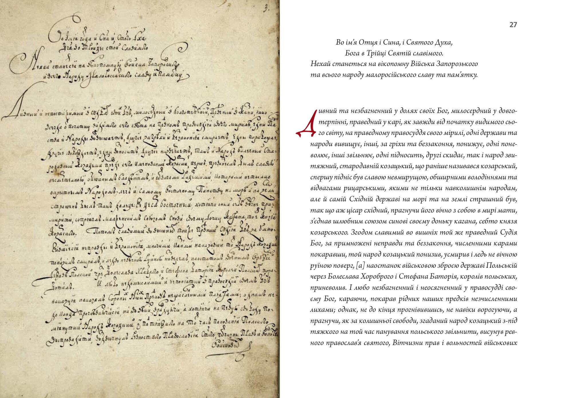 Відкрито цю невеличку за розміром, але дуже дорогу книжечку було на 2 і 3 сторінці. Тому що там прописані перші й основні параграфи устрою Козацької держави, які говорять: 1. Про Віру православну; 2. Про Непорушність кордонів; 3. Про Вічну дружбу з Кримським ханством. Тільки так процвітатиме Україна.