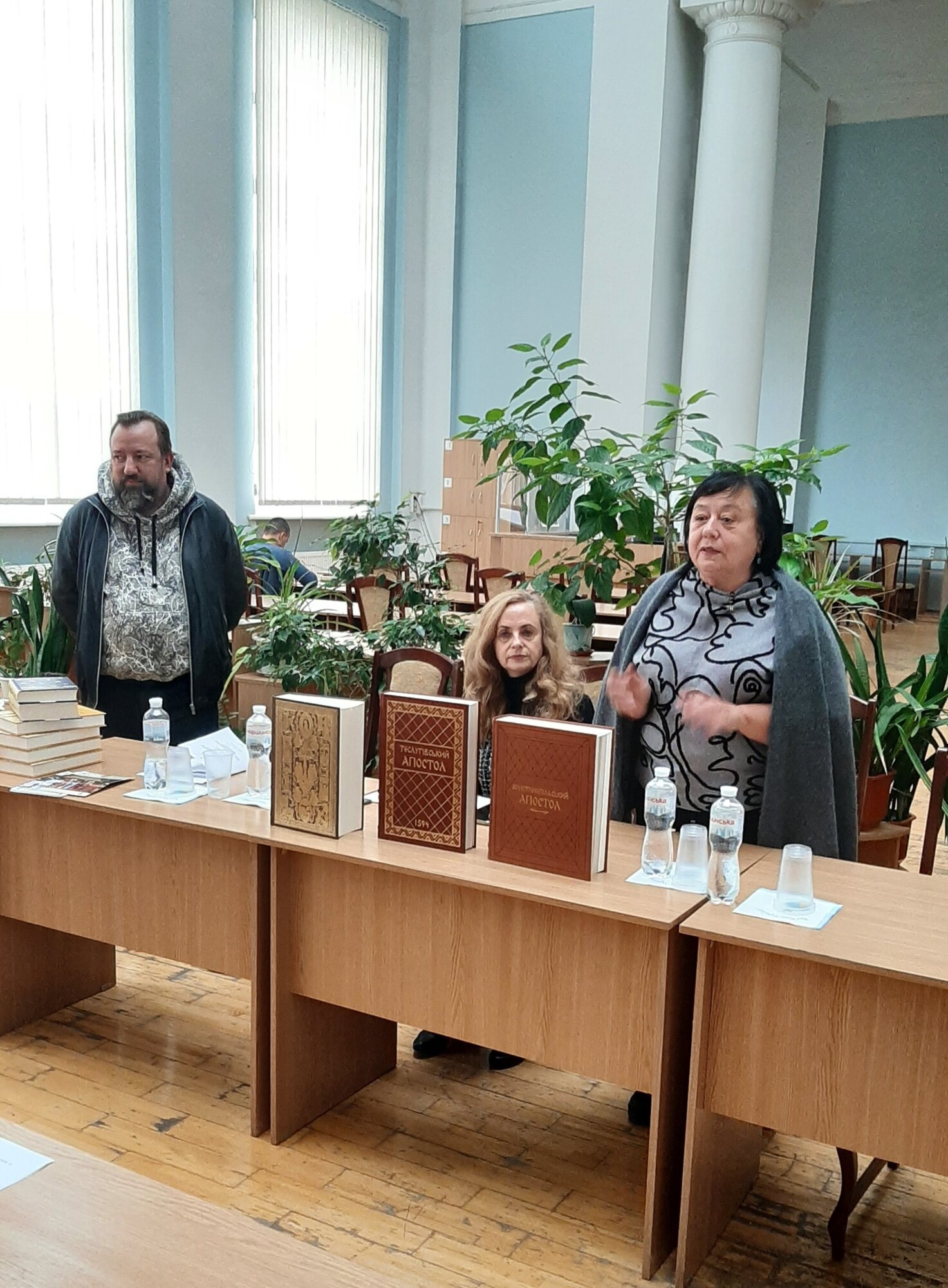Презентували факсимільні видання, які ми називаємо «Три воєнних Апостоли»: Христинопольський Апостол, Апостол Федоровича та Теслугівський Апостол, що вийшли в 2023 році. Це спільний проєкт з нашими партнерами, який символізує об’єднання українців під час війни.